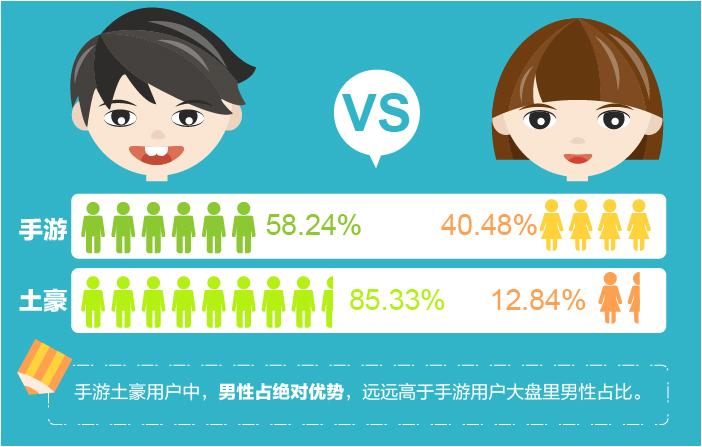- 手游土豪当中,男人们还是占了绝对优势,男:女 = 85.33% :12.84%