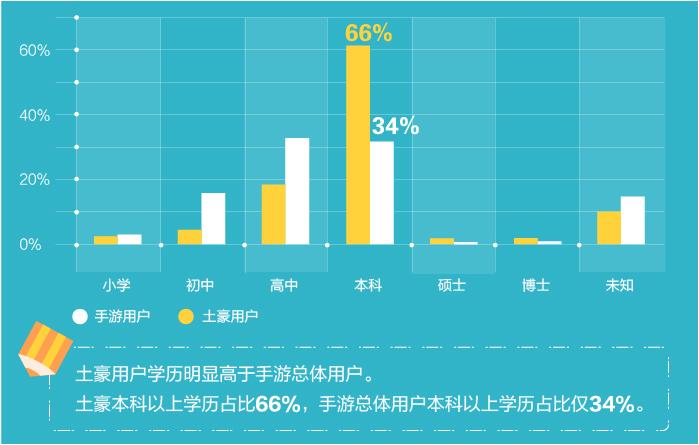 - 手游土豪的学历明显高于手游总体用户,本科以上学历的占比 66%