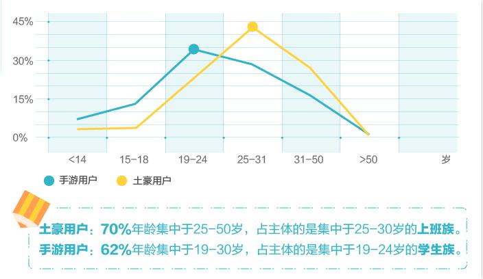- 手游土豪主要是 25~30 岁的上班族,70% 手游土豪的年龄集中于 25~50 岁