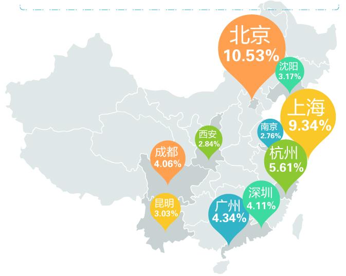 - 手游土豪主要集中在一线城市,其中,10.53% 的手游土豪驻扎在北京,让帝都成为当仁不让的“手游富豪之乡”,其他手游富豪的聚集地包括上海(有 9.34% 的手游土豪)、杭州(有 5.61% 的手游土豪)、广州(有 4.34% 的手游土豪)、深圳(有 4.11% 的手游土豪)