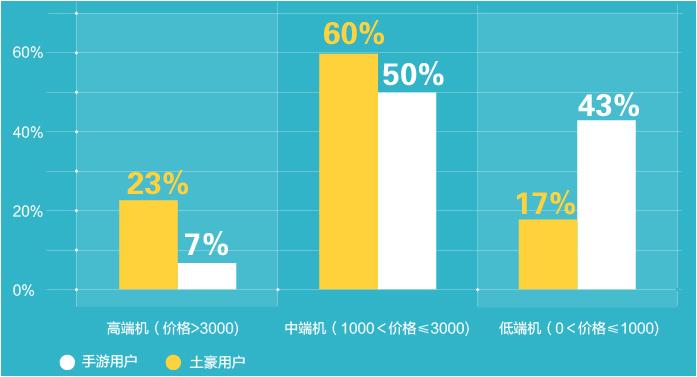 - 60% 的手游土豪使用的是价位在 1000~3000之间中端机,23% 使用的是价位超过 3000 的高端手机。手游土豪们使用的 Top 5 手机品牌为苹果、三星、华为、OPPO、联想;手游土豪们使用的 Top 5 手机型号为 iPhone 4、iPhone 5S、iPhone 4S、iPhone 5、Samsung NOTE 2 (N7 100)