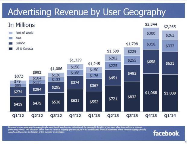 Facebook今天发布了2014财年第一季度财报。据财报显示,Facebook第一季度营收为25.02亿美元,比去年同期的14.58亿美元增长72%;第一季度运营利润为10.75亿美元,比去年同期的3.73亿美元大约增长了三倍。