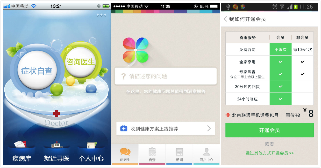 “春雨医生”2011年上线移动APP,当时还仅有“症状自查”与“咨询医生”两大主要功能。并且,当时的“咨询医生”还会限制用户的咨询次数,每天只能问一次。三年多的时间里,“病患自查”通过累积用户提出的上百万条咨询数据,推出了病患自查的智能搜索引擎。而“咨询医生”现在已经通过众包机制做到了24小时随时待命的医生咨询服务,还上线了会员制。除此之外,“春雨医生”还推出了自己的健康工具、上线了资讯模块。服务不仅变得多样,并且也具有了相当的深度。