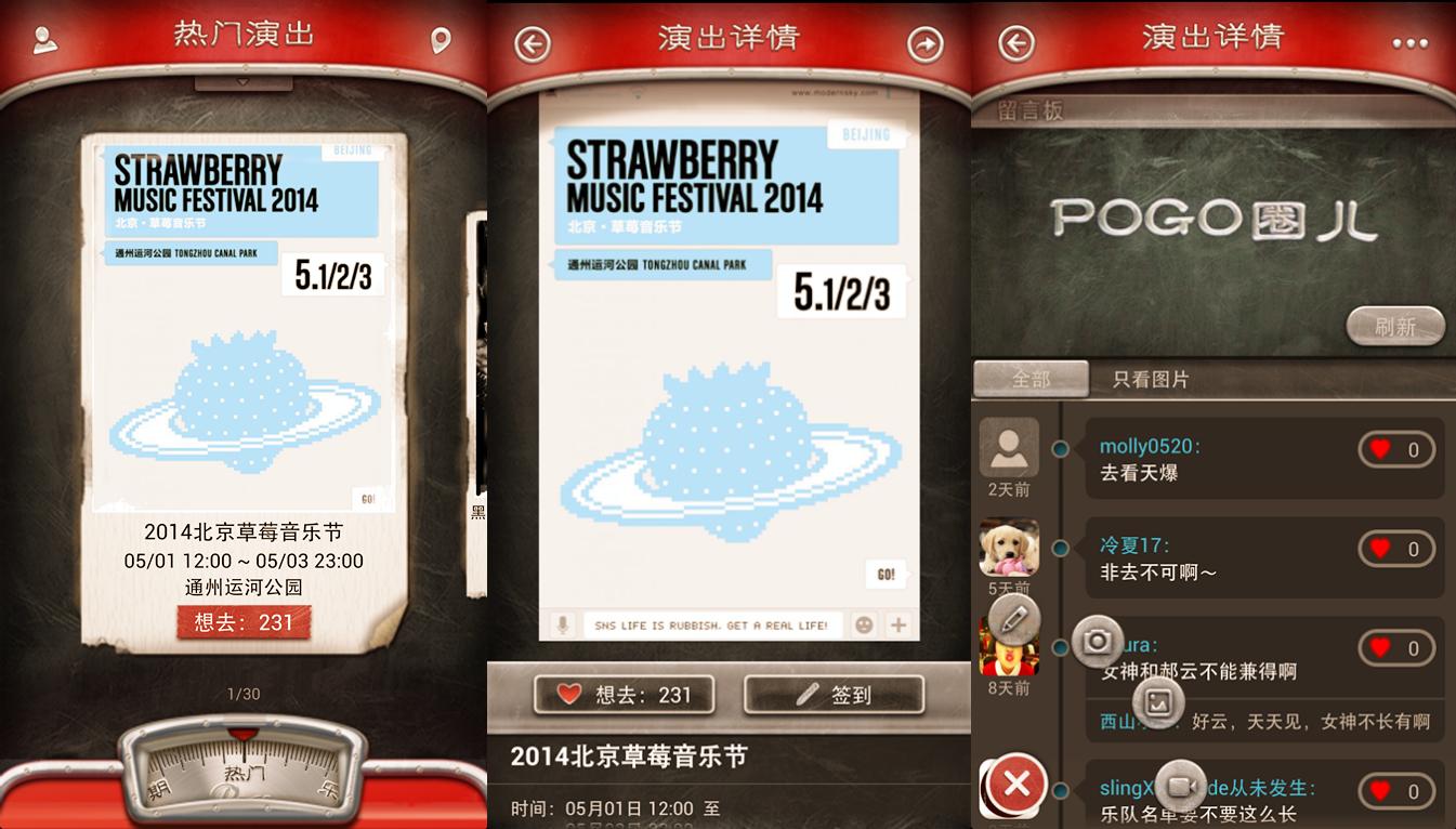 在演出搜索方面,用户可在“Pogo看演出”里按照场地、日期、热门、乐队4个维度查询,每场演出都有独立的页面,集演出信息和社交元素为一体。用户在此除了能看到演出时间、地点、票价、订票方式等基本信息,还可在“演出阵容”版块中看到参演的音乐人或乐队列表,点击可查看他们过往及未来的演出信息,在“想去的人”版块中查看小伙伴们的个人资料,发起点对点私聊,在“留言板”版块中以文字、图片、视频的形式上传你的想法或演出现场情况,“留言板”中所有内容以时间流形式显示,用户可对他人上传内容进行评论。
