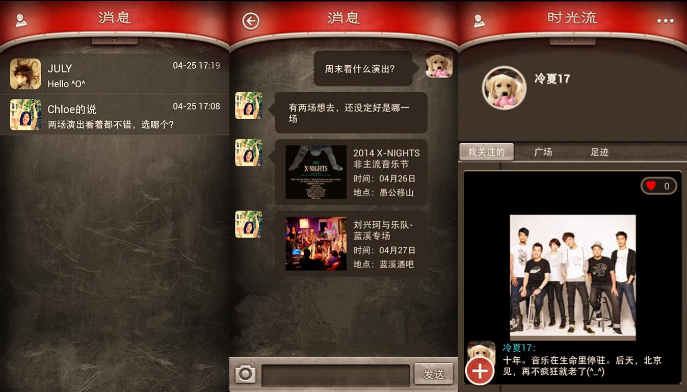 “Pogo看演出”的社交架构有微信的影子。“私聊消息窗口”类似微信的“聊天”界面,用户可同好友或陌生人进行点对点聊天,分享演出信息;“时光流”则像开放式的“朋友圈”,用户可在此看到自己和他人发布的时光流信息。