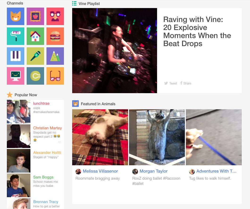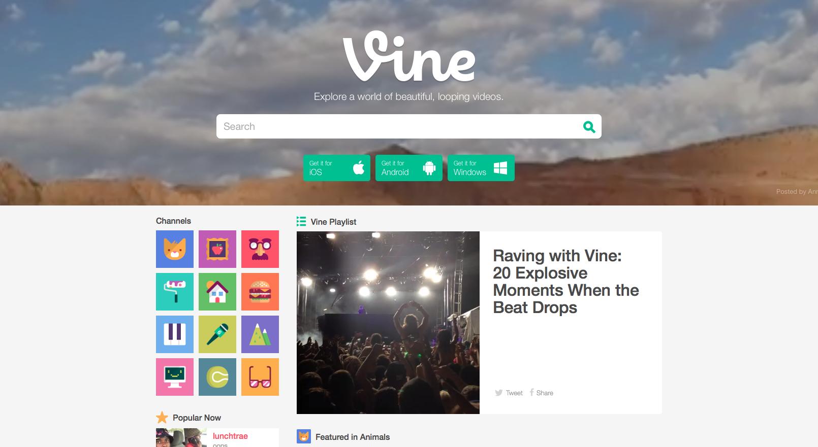 新主页取消了必须登录才能使用服务的要求,并且加入了移动端的诸多以内容发现与探索为主的功能,例如播放列表、热门用户、热门视频及频道分类等。主打内容发现的更新俨然让 Vine 网页版变成了短视频版的YouTube。
