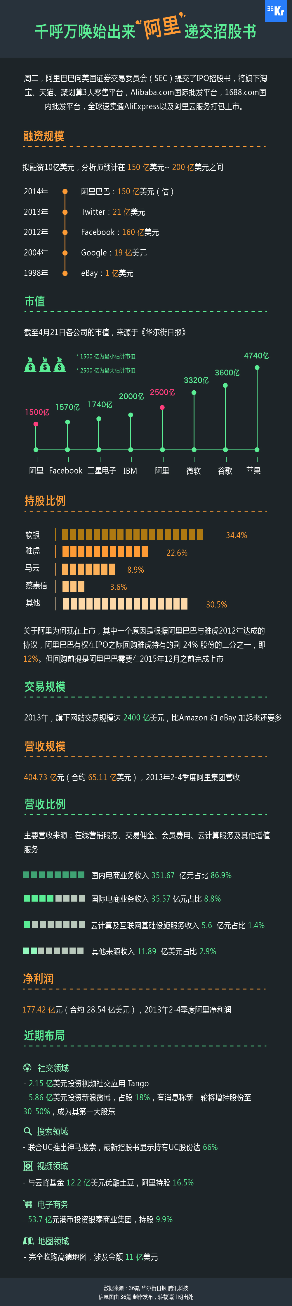 今天凌晨,阿里巴巴正式向美国SEC递交了招股说明书,虽然也还没公布拟挂牌交易所、股票代码、发行股数、发行价区间等信息,但这一天终究是来了。据招股书显示,阿里巴巴此次IPO,是将旗下淘宝、天猫、聚划算3大零售平台,Alibaba.com国际批发平台,1688.com国内批发平台,全球速卖通AliExpress以及阿里云服务打包上市。