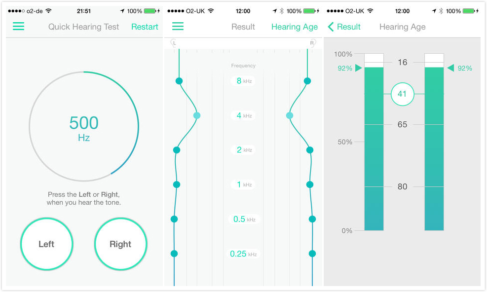 “Mimi”的APP设计的非常优雅,目前只有iOS版。所有界面都使用了清新的淡绿色,并且功能也相当强大。目前主要功能就是听力状况测试。APP使用的检测手段与专业检测方式非常类似(因为我两边都体验过),APP会从一个较低的频率开始,随机通过左边或是右边的耳机播放声音,听到相应的声音后就在屏幕相应的“左”(left)或者“右”(right)按钮上按一下,反复几次之后,APP会根据你识别声音的情况生成一个听力统计图,显示在相应频率的听力状况,并用年龄的方式表示你目前的听力状况。比如虽然你才22岁,但你的听力可能已经是45岁。