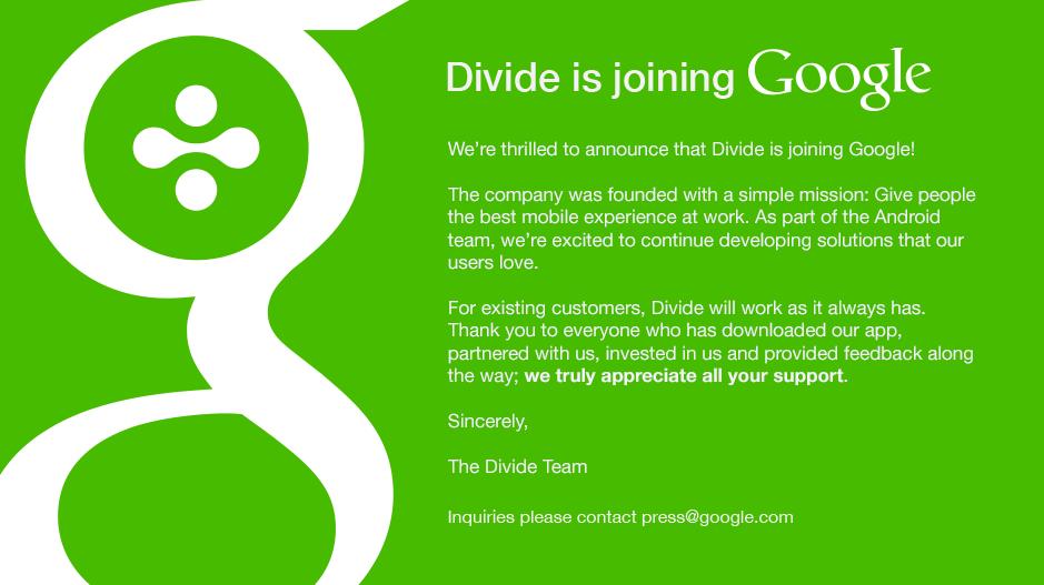 Google 收购了以为企业用户提供移动设备管理方案为主的初创公司 Divide,后者已经在官网上确认了这个消息。其他细节未知。