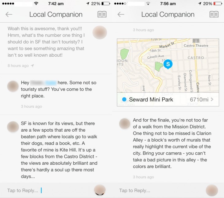 推荐系统也很不错。一旦你选择分享你所所订房间的位置,系统就会选出一位空闲的本地同伴来为你推荐些什么或者帮你看看你预定的住处附近有什么好玩的。匹配成功后,你就可以在接下来几小时内问各种问题。
