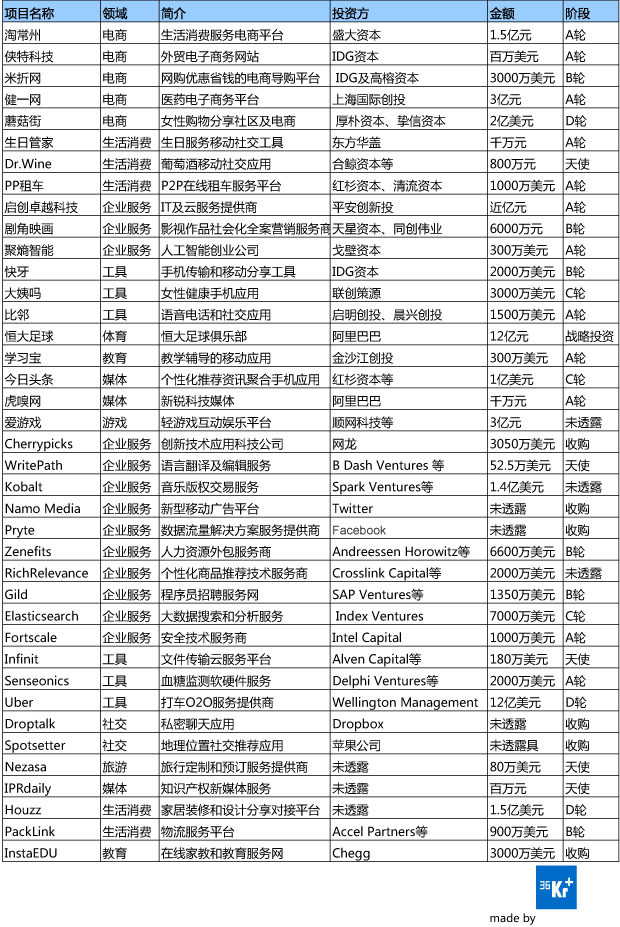就上周投融资情况来看,风险投资机构关注的重点领域有电商、企业服务、生活消费等方面。电子商务方面,外贸电商“侠特科技”获得IDG资本数百万美元A轮投资;蘑菇街获得厚朴资本、挚信资本领投的2亿美元D轮投资 。生活消费方面,PP租车获得红杉资本、清流资本联合投资的1000万美元A轮投资;生日管家获得东方华盖领投的千万元A轮投资。企业服务方面,大数据搜索和分析服务Elasticsearch获得7000万美元C轮投资。其他国内投融资案例涉及的领域还包括工具、娱乐、教育等。国外还有工具、教育、社交、旅游等方面受到资本关注。