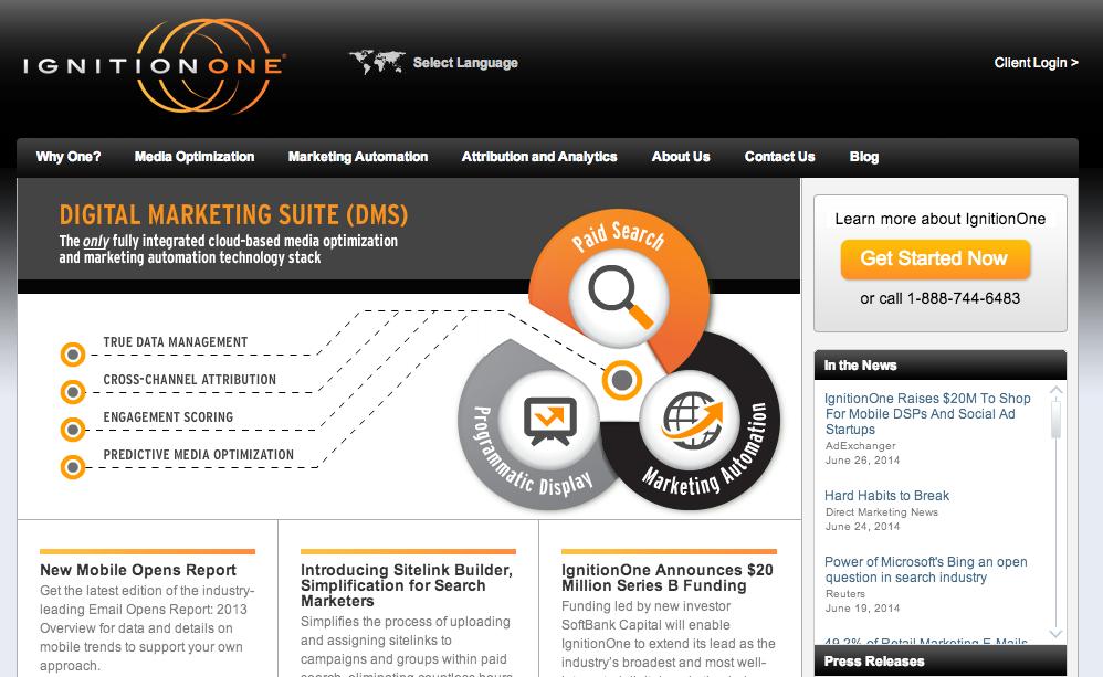 IgnitionOne 是一家云数字营销技术方案提供商,市场营销人员可通过其数字营销套件(Digital Marketing Suite) 来购买、管理、优化其分布在搜索、社交网站或移动互联网等多个渠道上的数字多媒体数据,同时其“数据管理”服务也可帮助市场营销人员理解客户,以此来优化营销。