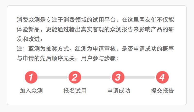 回到“众测”,其实它很容易理解,它和众筹关系不大。这是一种通过商家提供测试产品、用户进行免费试用并发布使用体验的形式,实现对还未上市或开售产品的测试。