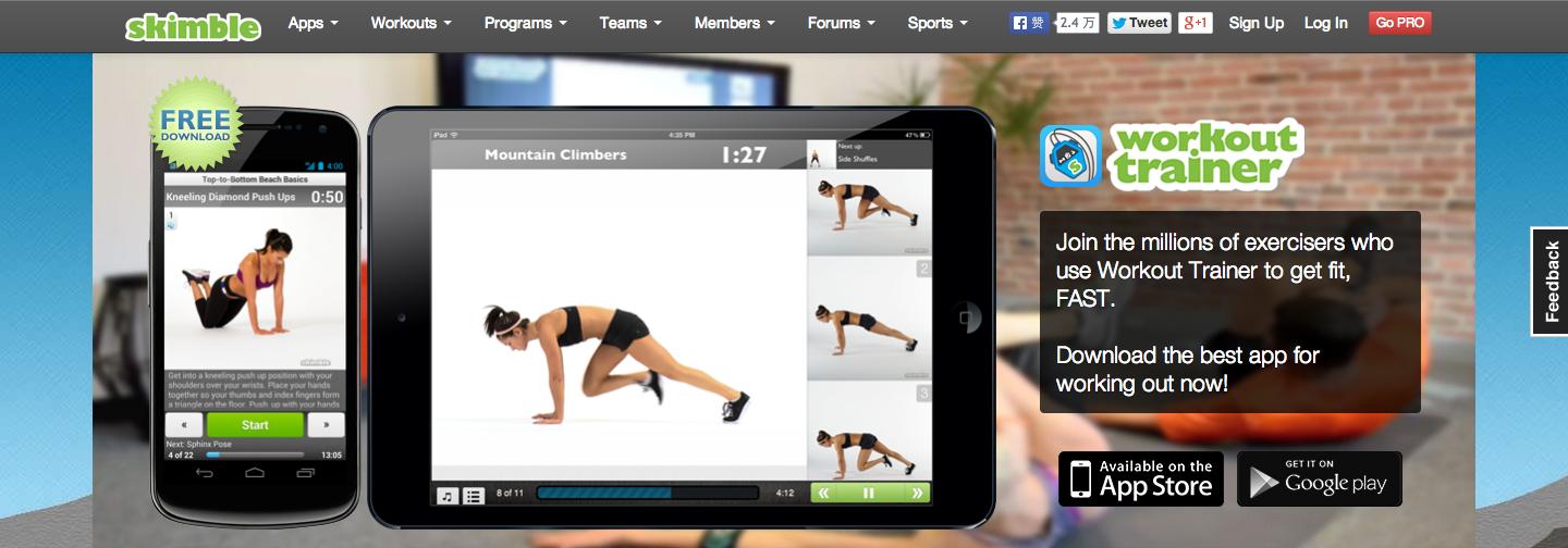 Skimble 是一个专注于健身教练的跨平台APP,用户可以使用 Skimble 找到适合自己的健身教练(语音资料,付费后可以有视频资料)、设定符合自身需求的健身运动组合,还可以通过健身取得成就,分享到自己的社交网络。