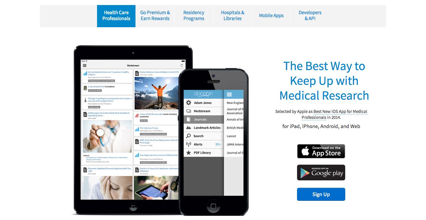 Docphin 是一个移动平台的医学研究杂志、文献聚合平台,可以帮助医生们获得关注领域最前沿的研究报告,目前已有 iOS 以及 Android 客户端。主要的优势体现在 :