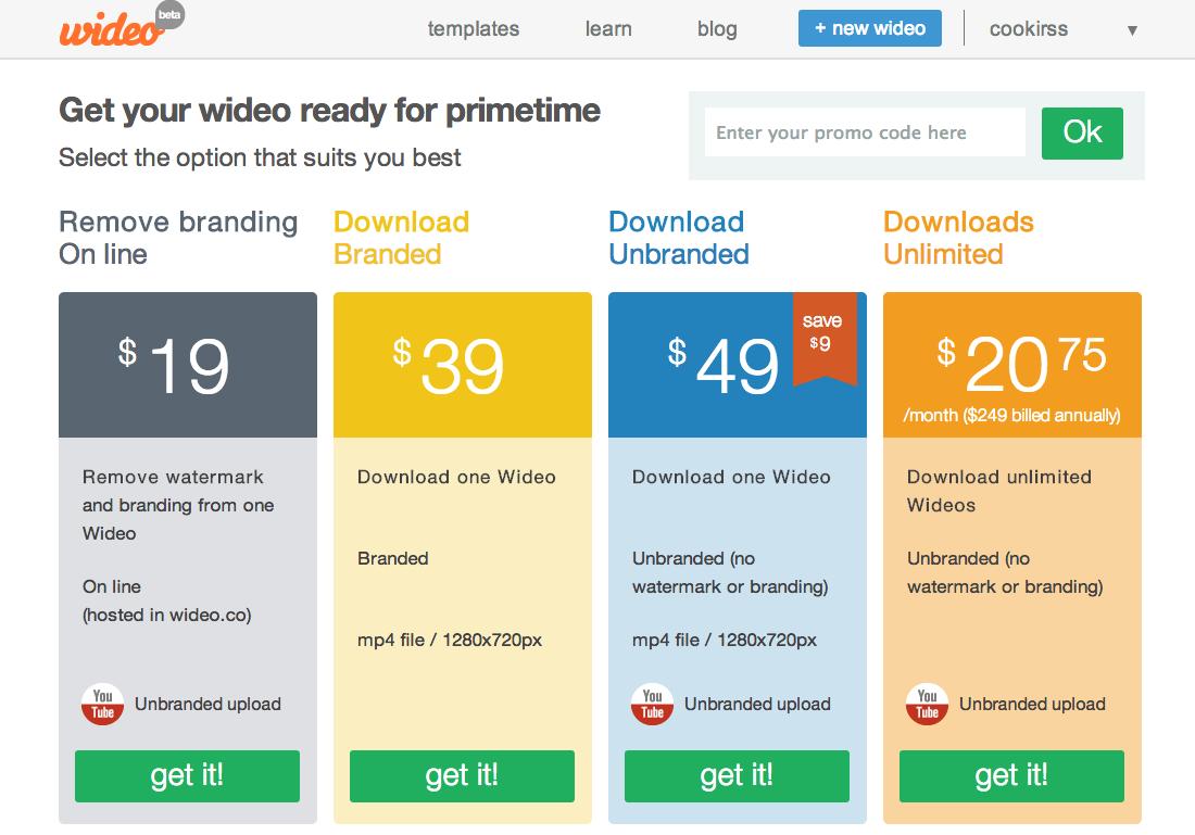 目前 Wideo 的基本服务是免费的,视频可以免费分享到社交网络,但下载、去水印就得掏钱了。Wideo 现在去水印收费19美元,下载收费39美元,你也可以月付20.75美元,获得无限制的去水印下载。