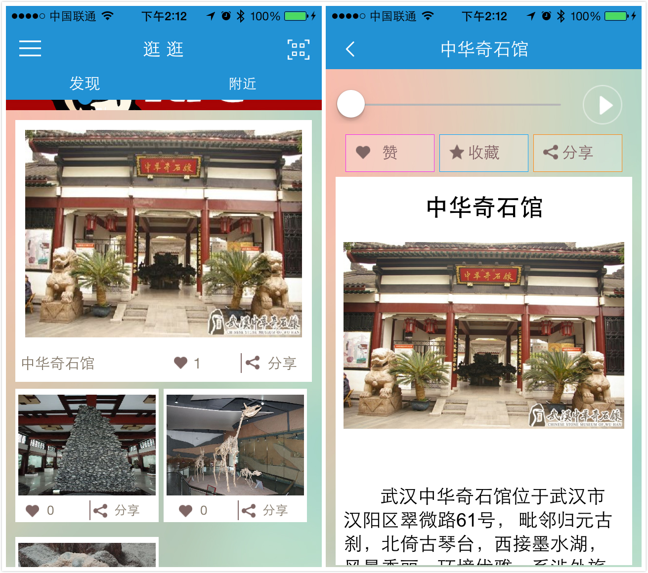 逛逛科技是一家做iBeacon基站设备和方案的公司,主打智能导游、智能商场服务,今年2月份刚刚成立,已获得百万级种子资金。最近他们在武汉的中华奇石馆部署了一套基于iBeacon设备的智能导游方案,当用户走到相应景点时,会自动为iPhone用户推送该景点的语音介绍。安卓用户可以扫描相应的二维码查看语音解说。该方案已于6月份完工,Android版本的配套应用已经发布,iOS版本的应用还在Appstore审核。