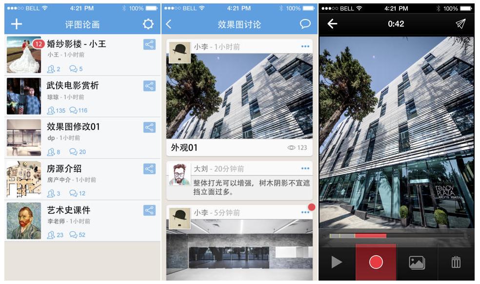 拿设计师来说,通过评图论画,设计师可以先从本地相册中导入设计稿、图片或者任何辅助性的内容,作为自己解说时的材料。操作步骤上,设计师先创建一个主题,然后按解说顺序,逐张上传图片内容且附上每张图片的语音介绍。讲述时,设计师可做放大或者点按屏幕等动作,说明设计背后的理念和重点,评图论画会自动录制下屏幕所发生动作以及设计师的语音讲述,录制完毕会以视频的形式呈现。如果对哪一段不满意或者需要插入新的图片,可通过右划的方式调到对应的图片进行删除或者上传一张新的图片,最多支持半小时时长,支持分享至微信、微博、邮件等常规分享。