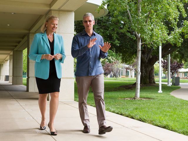 IBM也将开始向公司客户出售iPhone和iPad,此外还会投入10万人到这个项目里,包括咨询师和软件开发者。企业级应用可能会运行在IBM的公有云或私有云上。苹果CEO Tim Cook和 IBM CEO Ginni Rometty把这次合作描述为“仅有这两家公司才能实现的合作”。