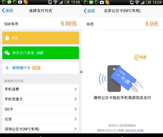 这次手机QQ也打算试水NFC支付功能,和北京亿阳汇智通合作。和以往不同的是,用户其实并没有脱离公交卡本身,而是把它当银行卡用:用户在打开手机QQ阅读的电子书时,可以选择公交卡支付,然后把卡放到手机背面NFC感应区,通过刷卡买电子书。