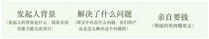 典型的众筹视频分为以下三个部分,第一部分介绍发起人的背景,第二部分阐述你们的产品解决了什么问题,第三部分是向观众要钱。一定要项目发起人亲自面对视频向观众要钱,是因为既然你是有求于人的,那你自己就得站住来。找第三者代替怎能表现出你的真诚,表现出你想实现这个目标的愿望呢?