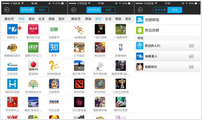 “友群”的CEO李杨认为,用户装了哪些App,其发生相关的行为的可能性是显然高于通常的兴趣标签选择方式的;因为大部分人都会选择自己“旅行”“摄影“这些标签,但大部分人都是不旅行的,也是不懂摄影的。“友群”的标签分为4类,一类就是各类App,希望为那些具有垂直社区属性的App沉淀下来的用户提供一个更高效的交流、交友场所;其次就是大家常见的爱好、生活、偶像等几个分类。LBS作为一个变量也会成为切割每个标签下小圈子的标准,毕竟,打个比方,36氪的读者那么多,不可能分在一个群组里交流讨论。