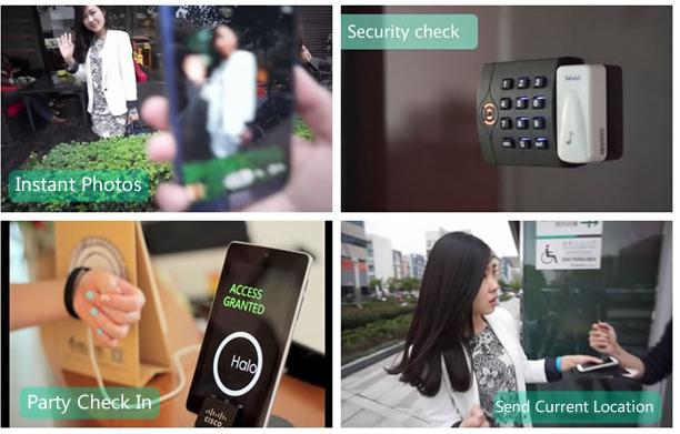 Haloband是一款智能手环,不过它跟 Jawbone、Fitbit 及国内众多手环产品在功能上有着本质的区别。Haloband并没有走国内热门的健康检测思路,而是利用 NFC,帮助用户更方便的控制智能手机。Haloband 内置 3 块 NFC 芯片,分别对应 A、B 和 Cloud 区,通过 A、B 区的六种交互方式 (可通过对应 App 自定义,如下图),可帮用户快速实现抓拍照片 / 视频、打开闪光灯、切歌、解锁、安全签到、导航、发送地理位置信息、快速拨号等。Cloud 区则可用于快速存储信息、交换电子名片等。