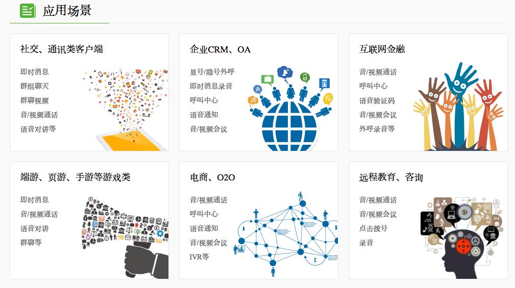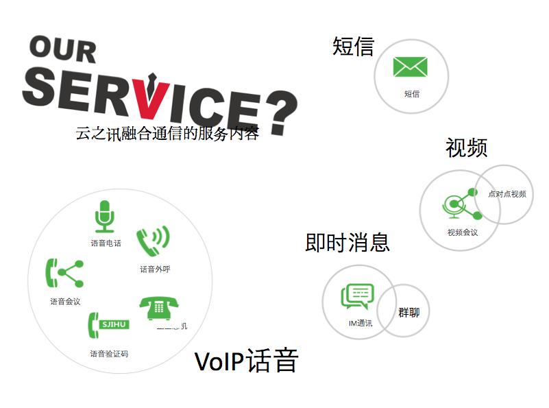 简单来说,云之讯融合通讯开放平台主要面向互联网和移动互联网的开发者和中小企业,通过融合三大运营商和互联网 IP 网络,经由云端开放的 REST API 和移动客户端 SDK (Android、iOS、Windows,下载链接点这里 ) 两种方式,让企业和开发者更轻松的搭建语音、VoIP、IM、视频及短信等解决方案,给最终的用户提供类似skype、微信或者YY语音的网络通话功能。