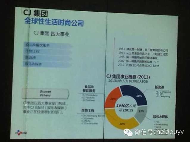 黑豆此文其实有彩蛋。这两张图是黑豆翻拍的CJ E&M介绍自己业务的PPT。如果你没发现,黑豆告诉你,全球性生活时尚公司,哈哈。韩国人中文还是不过关啊,看来中国市场这事儿,还得中国人自己来。
