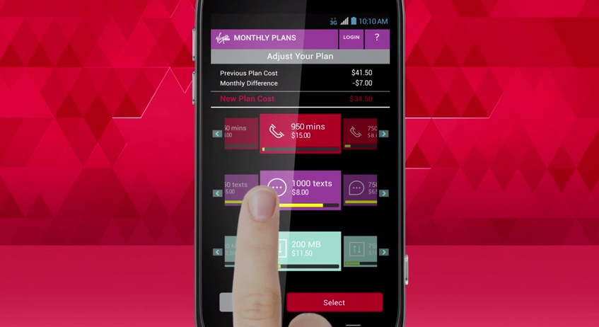 Virgin Mobile Custom的最大特点是在计费周期内可以自由定制套餐。比方说,用户可以在一开始选择1250分钟通话的套餐,然后在使用过程中发现用不了这么多,那么账期结束前用户都可以对数量进行调整,比方说调整为1000分钟,调整后多出的钱(3美元)可计入下月,当然,如果上调则需要加钱。除了语音以外,短信和数据也可进行类似调整。这种调整可以每年、每月、每星期、每天乃至于每小时进行一次。调整的最小颗粒度为250分钟、250条短信及250MB流量。