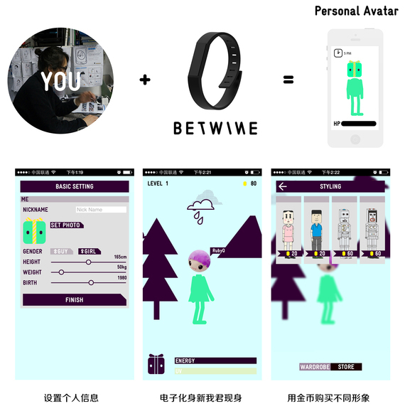 新我Betwine是一款具有游戏互动的智能手环,不过与其他手环不同,Betwine主打的并不是计步,而是久坐提醒。每位 Betwine 的用户可以在手机应用中有一个电子化身,叫“新我君”,新我君会追随你的动作,跟你一起走、坐或者跑。新我君还有一个血条,模拟你的健康状况,如果你一直坐着,血条会慢慢降低,低到警戒线时新我君也就扑街了,也就是提醒你该走走了。