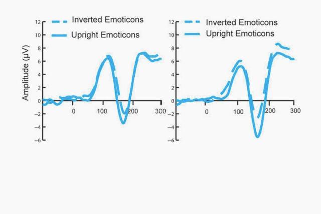 倒置的表情符号,N170与正常的表情符号相比波振幅降低。via Churches et al (2014), Social Neuroscience。