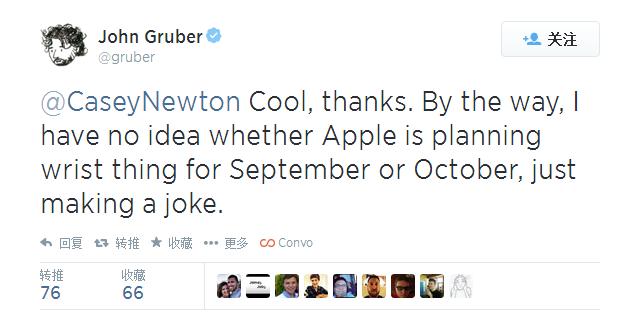 如果说被黑掉是一种难以言说的痛,iWatch不在9月发布又让我膝盖中了一箭……上个星期,新一波传闻“iWatch会在9月发布”向我袭来,可是最近,这条消息的始作俑者、知名科技博主 John Gruber,发布 twitter澄清了此事,称 iWatch 在九月发布只是个玩笑。