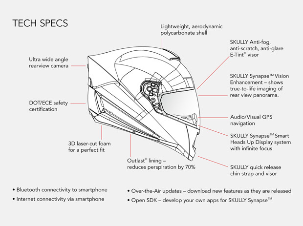 Skully AR-1 还内置了GPS导航系统,通过HUD投影到前方视野中,为用户导航。Skully AR-1可以和智能手机相连,实时查收信息、接听电话,甚至语音操控。在续航方面,Skully AR-1可以达到9个小时。
