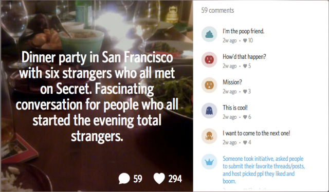 Re/Code的记者向我们分享了这样的体验。聚会通过Secret召集,申请人会收到关于聚会细节的邮件。聚会房间的门上贴着纸条,“你知道你是谁,请进”。没花太长时间寒暄大家开始愉快地交谈,发起人Kai 就开始吐槽人们在社交网络上的面具,也包括他自己的:“各种各样的渡假照片都在说看我多牛逼……今天我买了微软的股份,昨天我作为合伙人开了一家公司”。