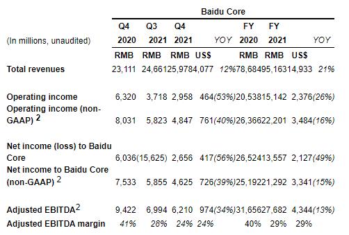 财报数据显示,2021年第四季度,百度实现营收331亿元,归属百度的净利润(非美国通用会计准则)达到41亿元;2021年全年收入1245亿元,同比增长16%。其中,百度核心业务(剔除爱奇艺业务之外的其他所有业务,包括在线营销业务和非在线营销业务)收入952亿元,同比增长21%;在线营销收入740亿元,同比增长12%;非在线营销收入212亿元,同比增长71%。爱奇艺收入306亿元,同比增长3%。