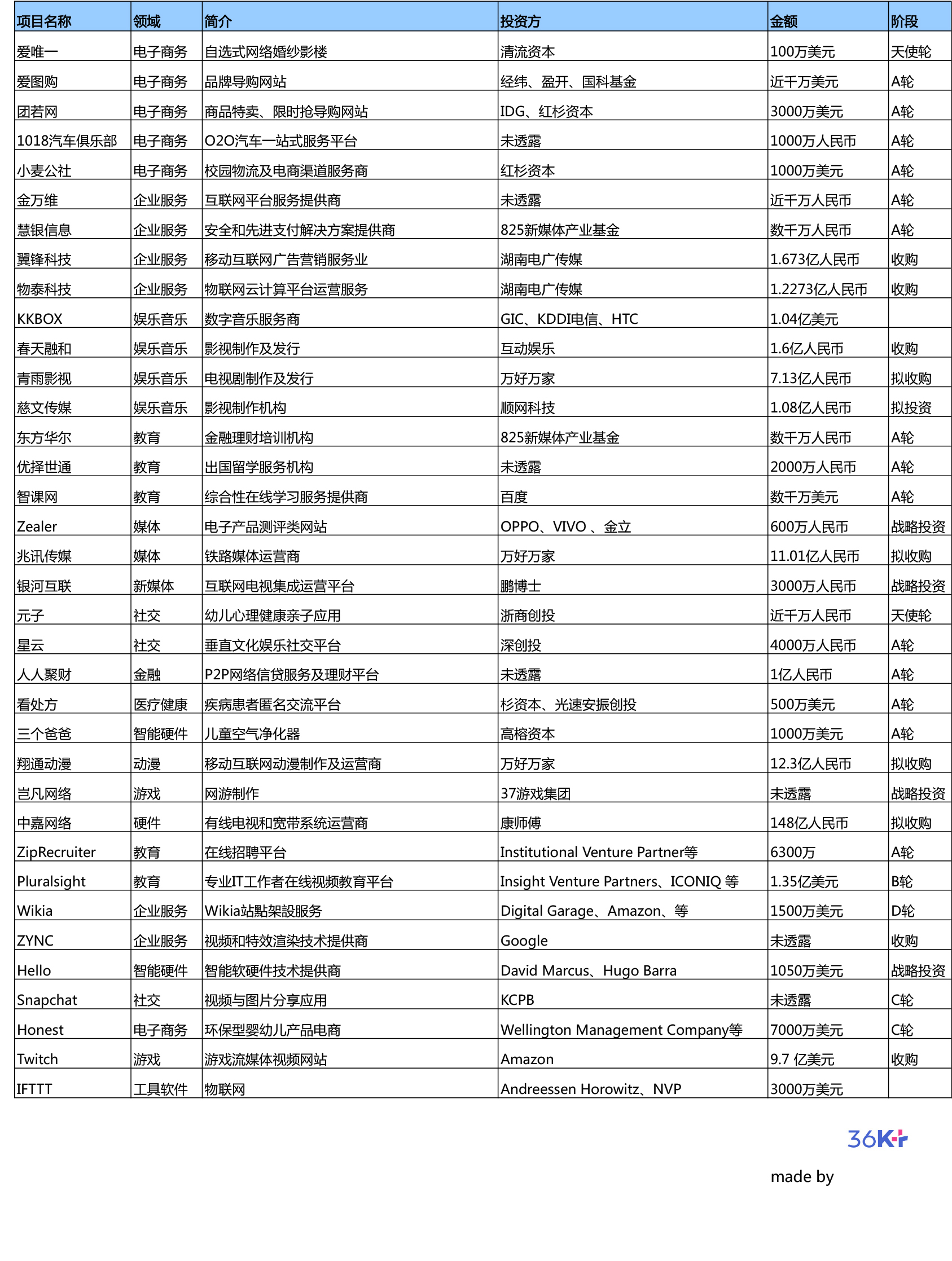 上周,从投融资案例来看,风险投资机构关注的重点领域有电子商务、企业服务、教育。电子商务方面,自选式网络婚纱影楼“爱唯一”完成100万美元天使轮融资;品牌导购网站“爱图购”、 商品特卖限时抢导购网站“团若网”均完成A轮融资;O2O汽车一站式服务平台“1018汽车俱乐部”获得A轮1000万人民币融资;关注校园物流及电商渠道服务的“小麦公社”获得红杉资本A轮1000万美元投资。企业服务领域,互联网平台服务提供商“金万维”和安全和先进支付解决方案提供商“慧银信息”均获得A轮融资。教育方面,金融理财培训机构“东方华尔”和出国留学服务机构“优择世通”获千万人民币A轮融资。综合性在线学习服务平台“智课网”获得百度A轮数千万美元投资。