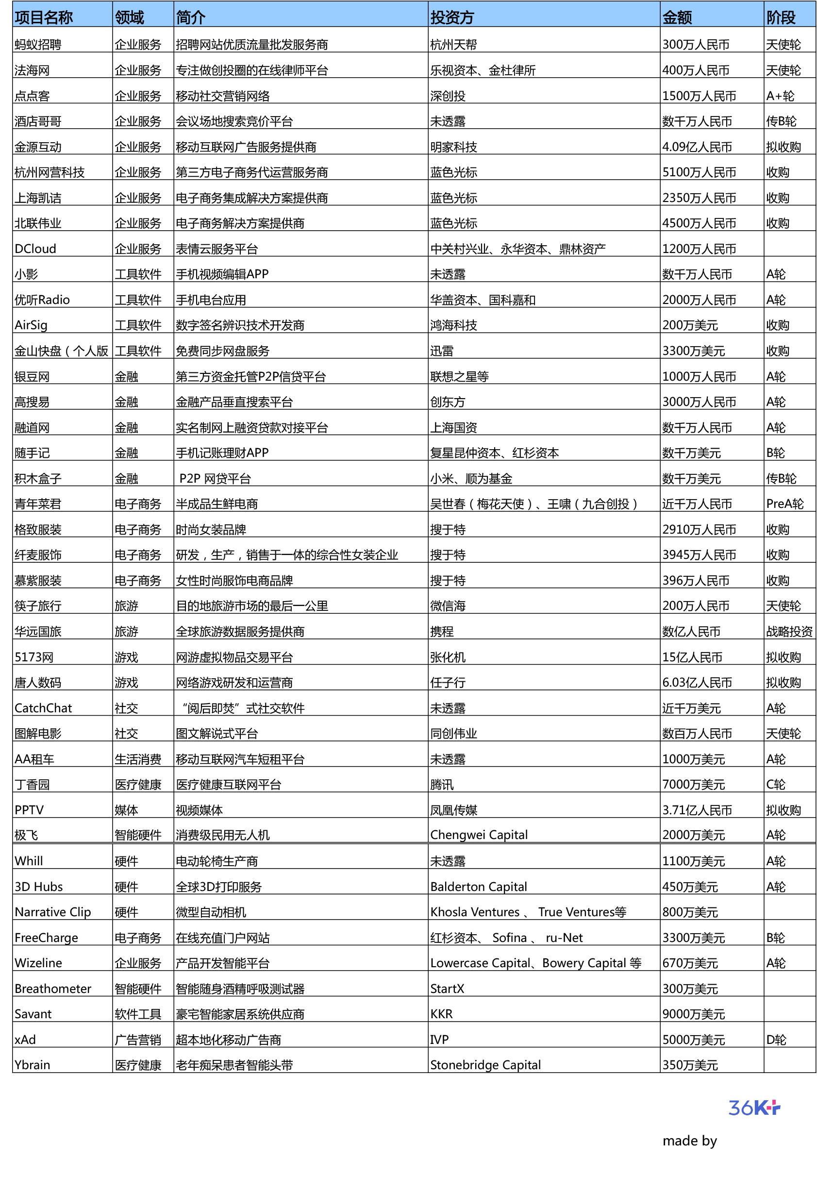 上周,从投融资案例来看,风险投资机构关注的重点领域有企业服务、工具软件、金融。企业服务领域,“蚂蚁招聘”获得杭州天帮300万人民币天使投资;专注做创投圈的在线律师平台“法海网”获得乐视资本、金杜律所400万人民币天使投资;移动社交营销网络“点点客”获得深创投1500万人民币A+轮融资,A轮融资总额达4000万人民币;表情云服务平台“DCloud ”完成1200万人民币融资。工具软件版块,“优听Radio”获得华盖资本、国科嘉和2000万人民币A轮融资;手机视频编辑APP“小影”获得数千万人民币A轮融资。金融理财方面,联想之星等1000万人民币投资第三方资金托管P2P信贷平台“银豆网”;创东方3000万人民币投资金融产品垂直搜索平台“高搜易”;实名制网上融资贷款对接平台“融道网”获得上海国资数千万人民币的A轮投资;手机记账理财APP“随手记”获得复星昆仲资本、红杉资本数千万美元B轮融资。