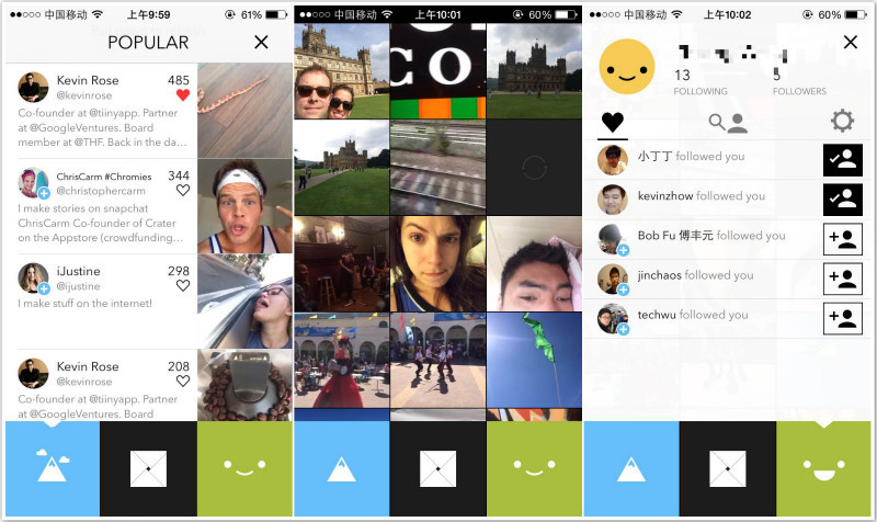 简单来讲,它是个照片和Gif图分享应用,然后内容24小时消失,且主打“上帝视角”。是这样的,所关注用户发布的照片和循环播放短视频都呈现在一个矩阵里,像素为212×212。用户长按拍摄按钮,松开手内容便会自动发布,落在一个新的方格里。双击的话可以点赞,不过内容不能手动删除,也不能点击看大图,只能等它24小时后自动消失。