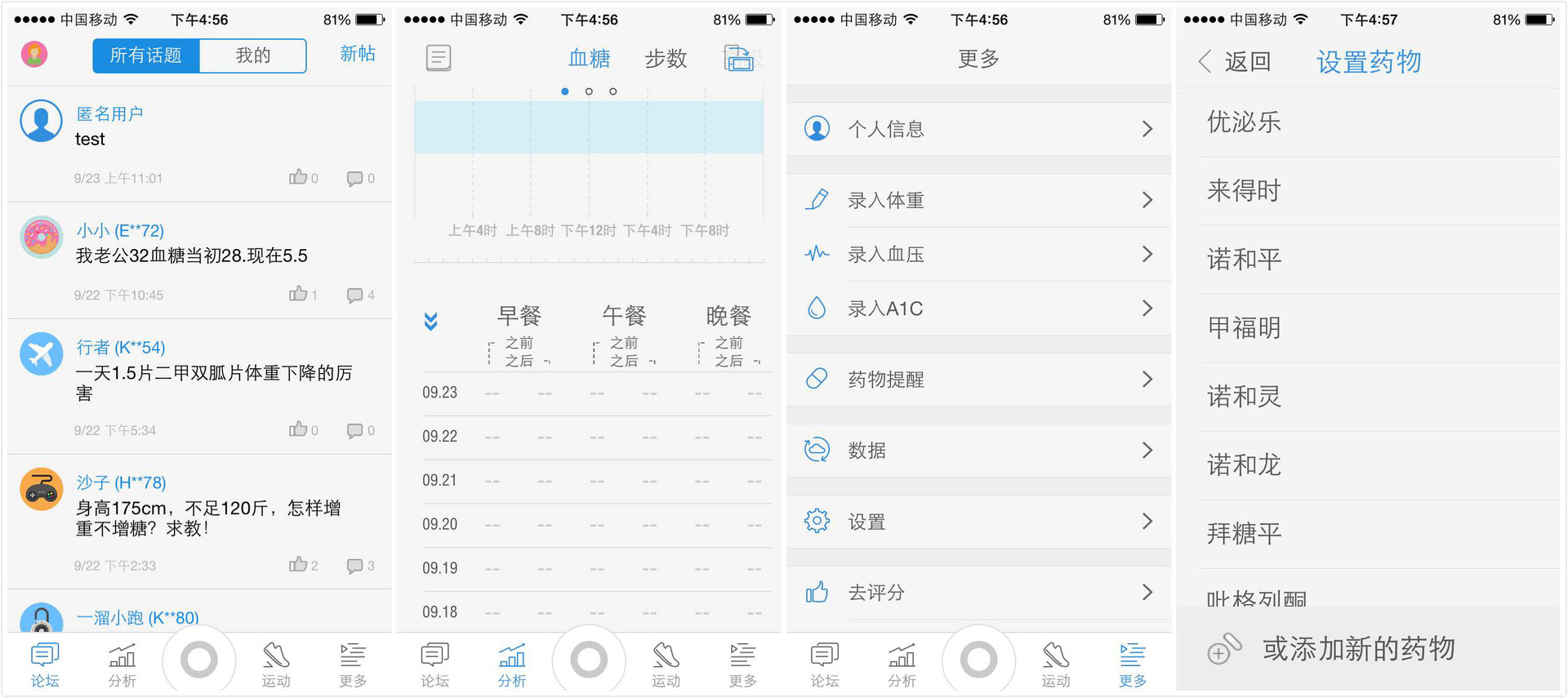 糖尿病动动则将重点放在血糖记录、药物提醒和运动记录+计划上,给我的感觉是易用性很强,比如药物记录时会显示所有常用药进行选择;在使用上也比较平滑,设计上很适合有一定年纪,还在培养App习惯的病友使用。