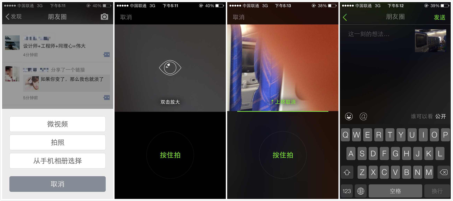 随着社交产品内嵌的那些操作简单、即时性强的视频分享方式越来越受欢迎,微信也仿佛按耐不住了。据了解,微信近期正在内测“微视频”功能,从媒体获得的谍照来看,与之前腾讯出品的微视不同,微视频更加强调原生视频分享,并且只会在微信里传播。