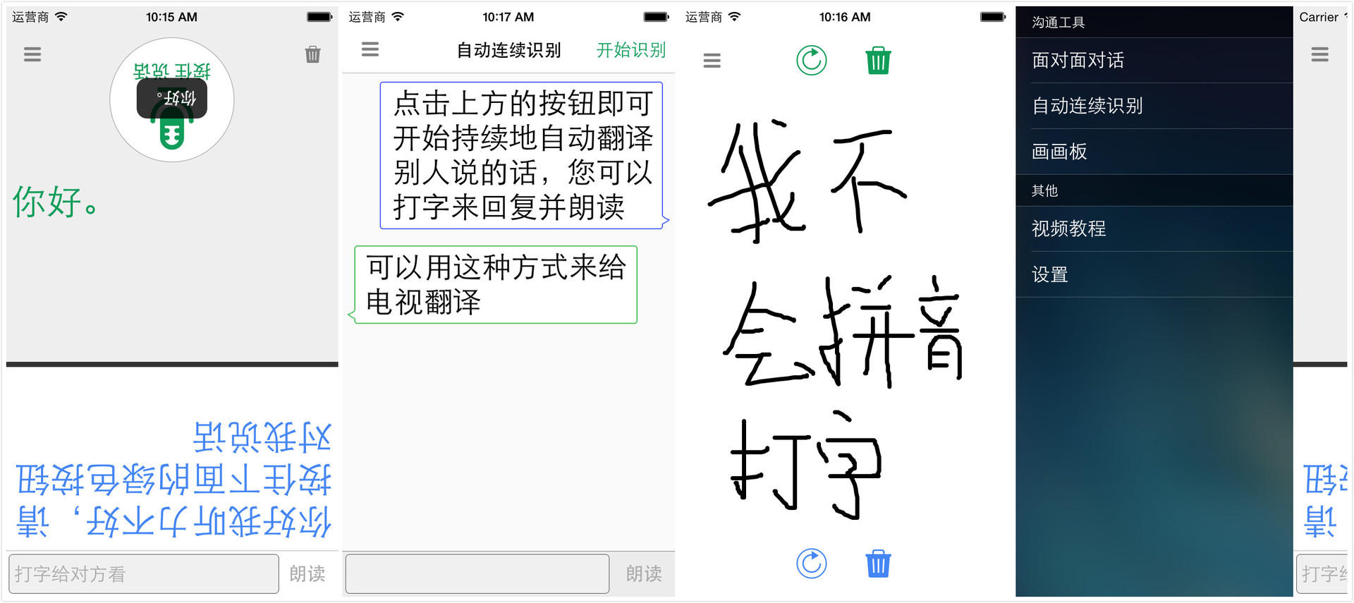 这款简单的软件是ThoughtWorks的用户体验设计师和iOS、Android开发工程师们,在业余时间做出来的一个项目,第一本版本是用HTML代码写的,嵌在PhoneGap里运行,只用了一个周末就发布了。在有了对听障者的深入了解后,他们也做了改版,现在的这些版本已经比较时候听障人士使用了。