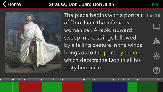 点击主页右上角的红字后,我们就可以进入古典音乐的直播间。因为目前 APP 的开发是为了去听 The Philadelphia Orchestra 的人们设计的,所以还没有音乐,但是通过幻灯片的形式,我们可以学到很多关于古典音乐的知识,高亮的英文点击后可以看到它的基本介绍。 LiveNote 还提供了音乐章节选择,字体大小和亮度的调节。