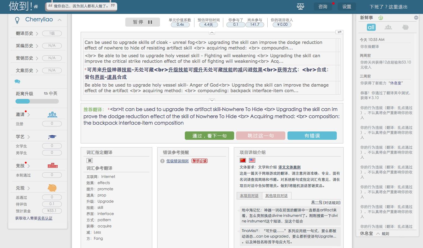 但是将同一文件分配给不同译者,如何保证翻译后的文档上下文通顺,且语言风格一致呢?具体来说,“做到!”设计了一个应对这个问题的翻译协作和审校的体系,比如当我拿到一个需要翻译的段落时,会配上前后的几个段落给我上下文的参考,同时也会将这篇文章里的一些惯用词标注出来,给翻译者一个提示,从而形成所有译者的规范统一。另外,“做到!”还有严格的经验等级体系划分,从而给不同能力级的人分配不同的任务,通常经验值较低的译者只能先做校对,当期校对准确率达到一定级别以后才可以进行文字翻译,这就同时解决了多人审校和新译者能力提升两个问题。当然最后,每个译者都会获得和翻译质量以及数量相匹配的薪酬结算。