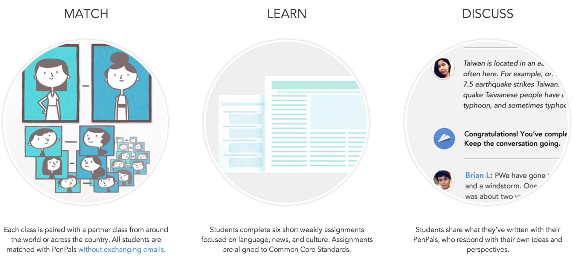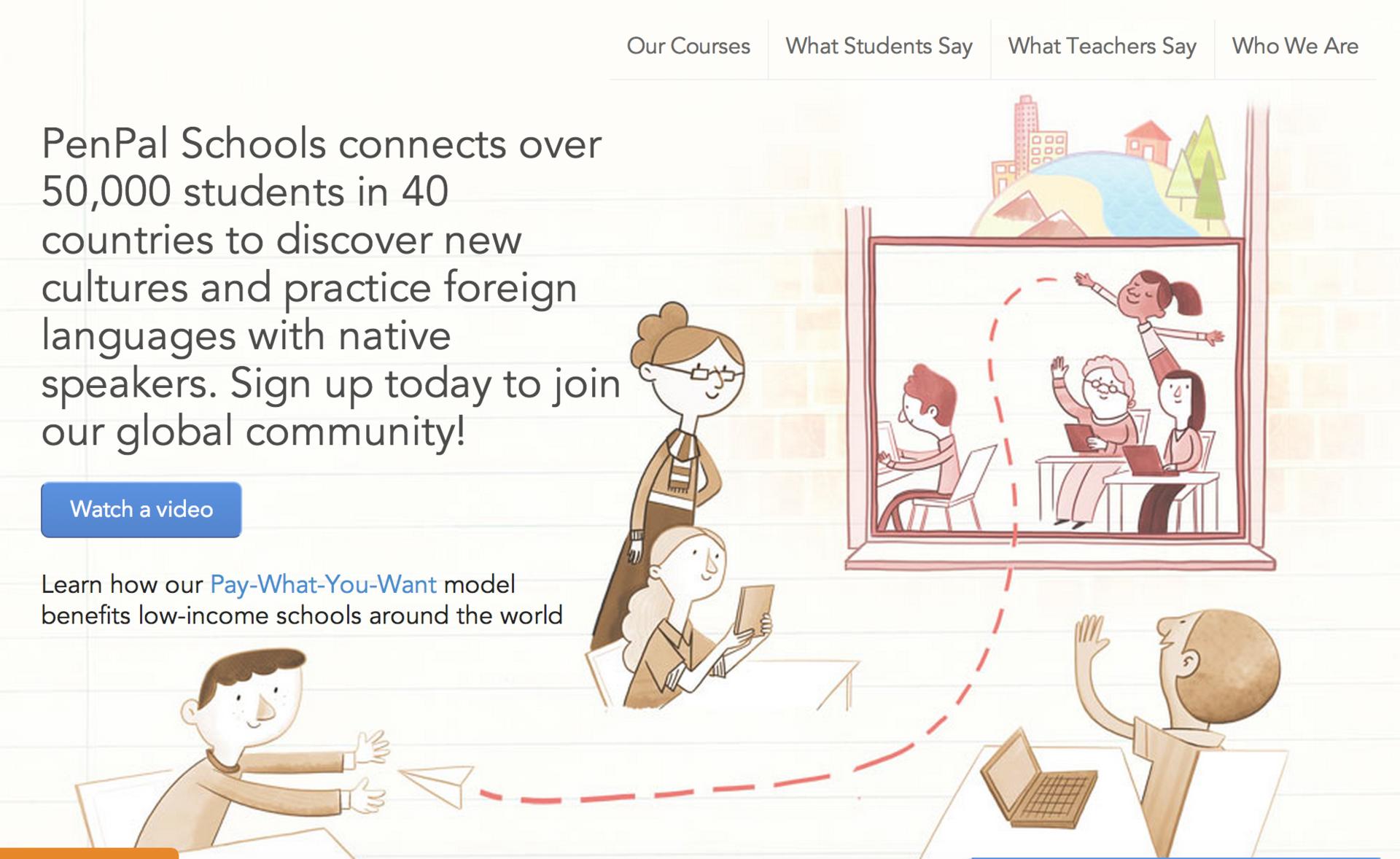 PenPal School是一个提供外语学习的在线教育平台,它为各个年龄段的学生提供6个星期的在线外语培训课程,课程内容涵盖多种外语学习的不同难度等级。但是与其他外语学习的在线教育平台不同的是,PenPal School的在线平台并没有外语老师,而是在学习的最初为所有学习者一对一匹配了互联网笔友,让课堂再次衍生。
