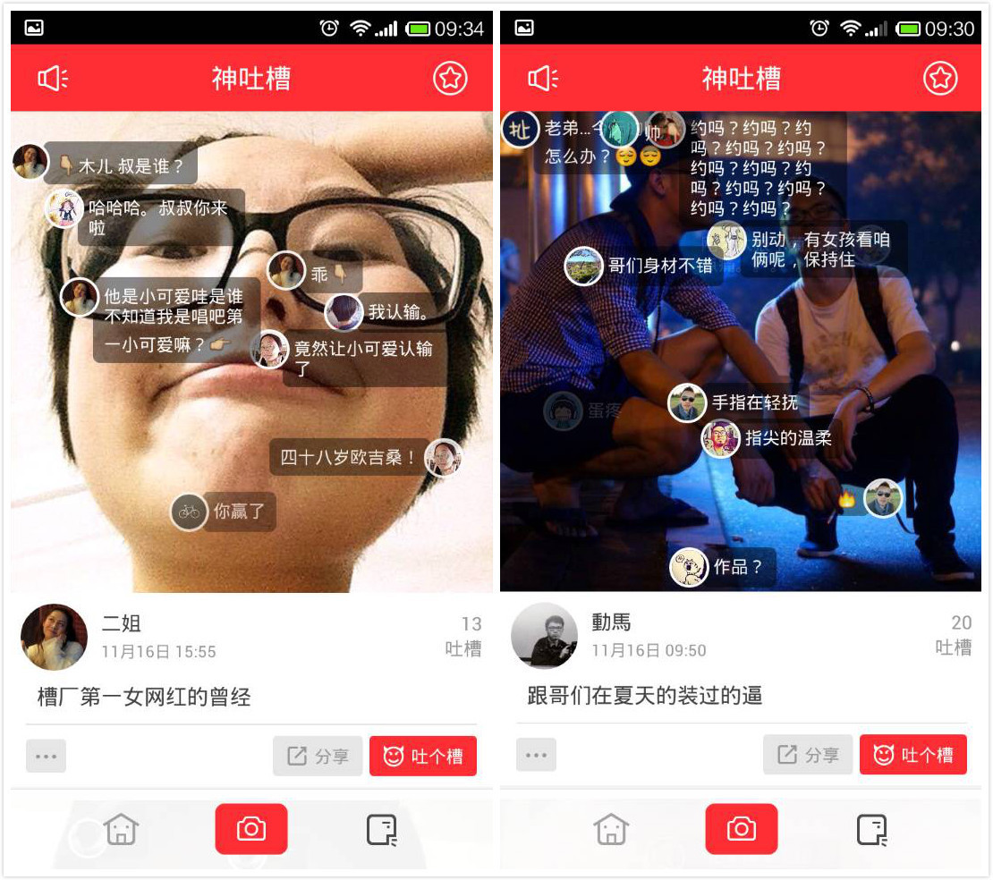“槽厂”是一款图片弹幕应用,类似视频弹幕哔哩哔哩的静态版。弹幕作为增强移动端社区参与感的流行手法,现已被越来越多要转战社交的媒体属性产品采用,比如节操精选即从图文“弹幕”玩起了互动;电影截图 + 评注的“图解电影”也是以静态弹幕为特色。