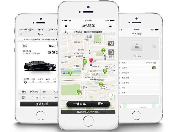 AA 租车在分时租车这块主要提供“一键来车”和“预约用车”两项主要服务,并有专门的接机、送机服务。同时,AA 也提供半日租和日租服务。
