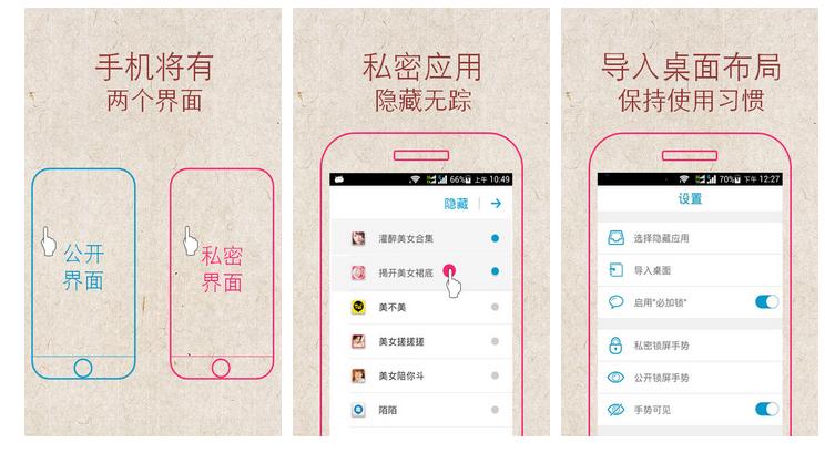 手机里是否总有几张照、几条信息,既不舍得删还不方便别人看?是否总不希望让人知道你一直在用陌陌或者Blued? 每次你把手机拿给别人时,是不是还有点提心吊胆、心惊胆战?估计这样的情形有不少人都经历过、痛苦过吧。我的一个朋友曾经备受苦恼,差点自己动手去开发一款这样的App,无奈会计专业出身。最近看到的关云藏隐私桌面(安卓版)就已经能比较好的解决这个问题了。