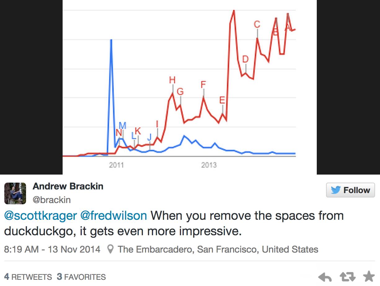 这两条tweet展现了我们公司投资的两家搜索引擎公司(DuckDuckGo和Blekko)之间的竞争,在这两张图里,我们不难看二者之间的差距在不断拉大。