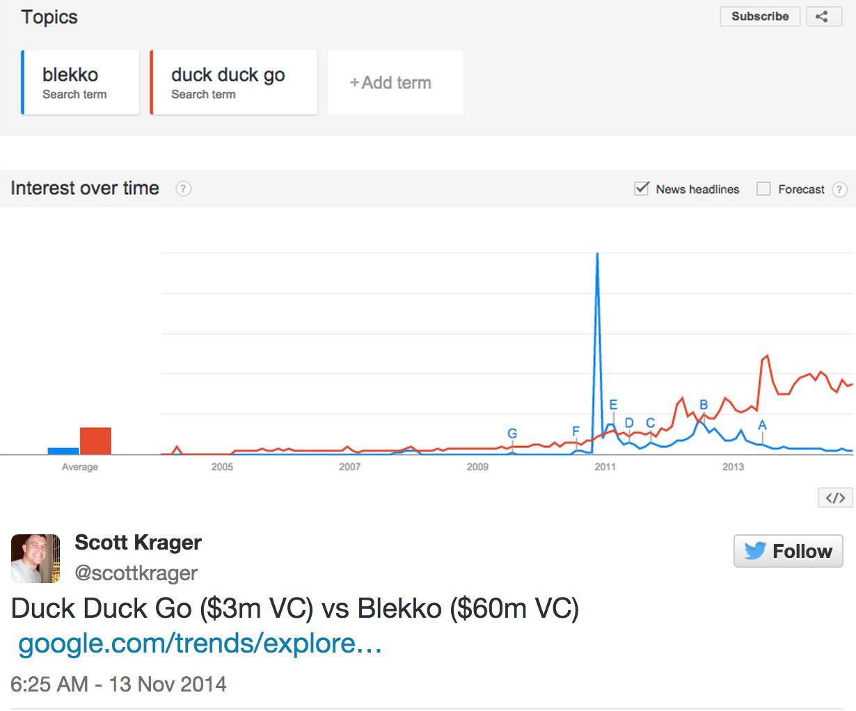 编者按:著名投资人Fred Wilson在“融资与成功”这个话题上做了一个总结,主要比较了他投的DuckDuckGo和Blekko两家竞争对手公司,Blekko 迄今已经获得了 6 千万美元的资本,而 DuckDuckGo 至今获得了 3 百万美元资本(他们一分都没花),但是Blekko 明显不如DuckDuckGo了。钱不是万能的,但没有钱也并非万万不能的。